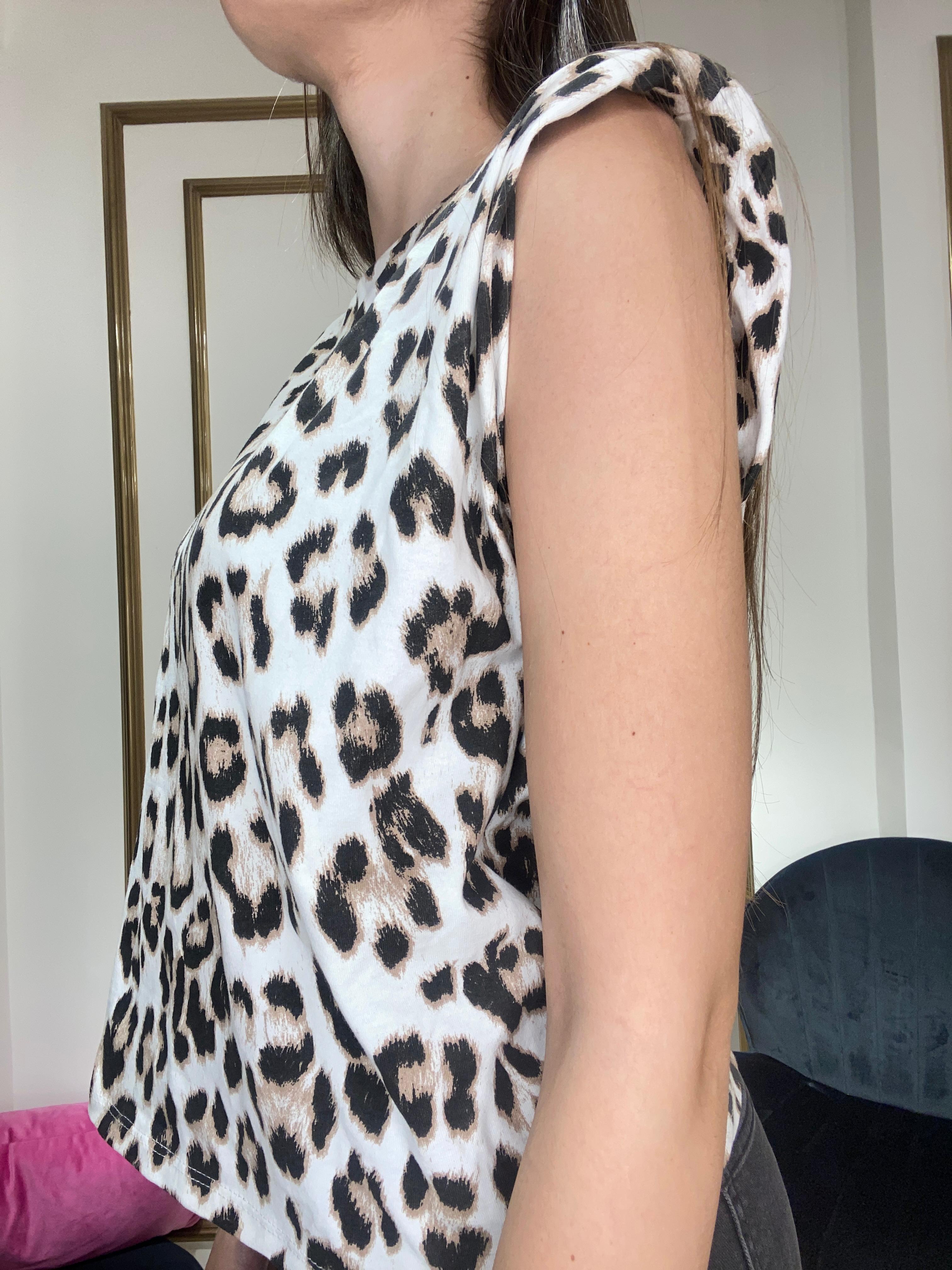 Maglia giromanica , con spallina fantasia maculata , in cotone