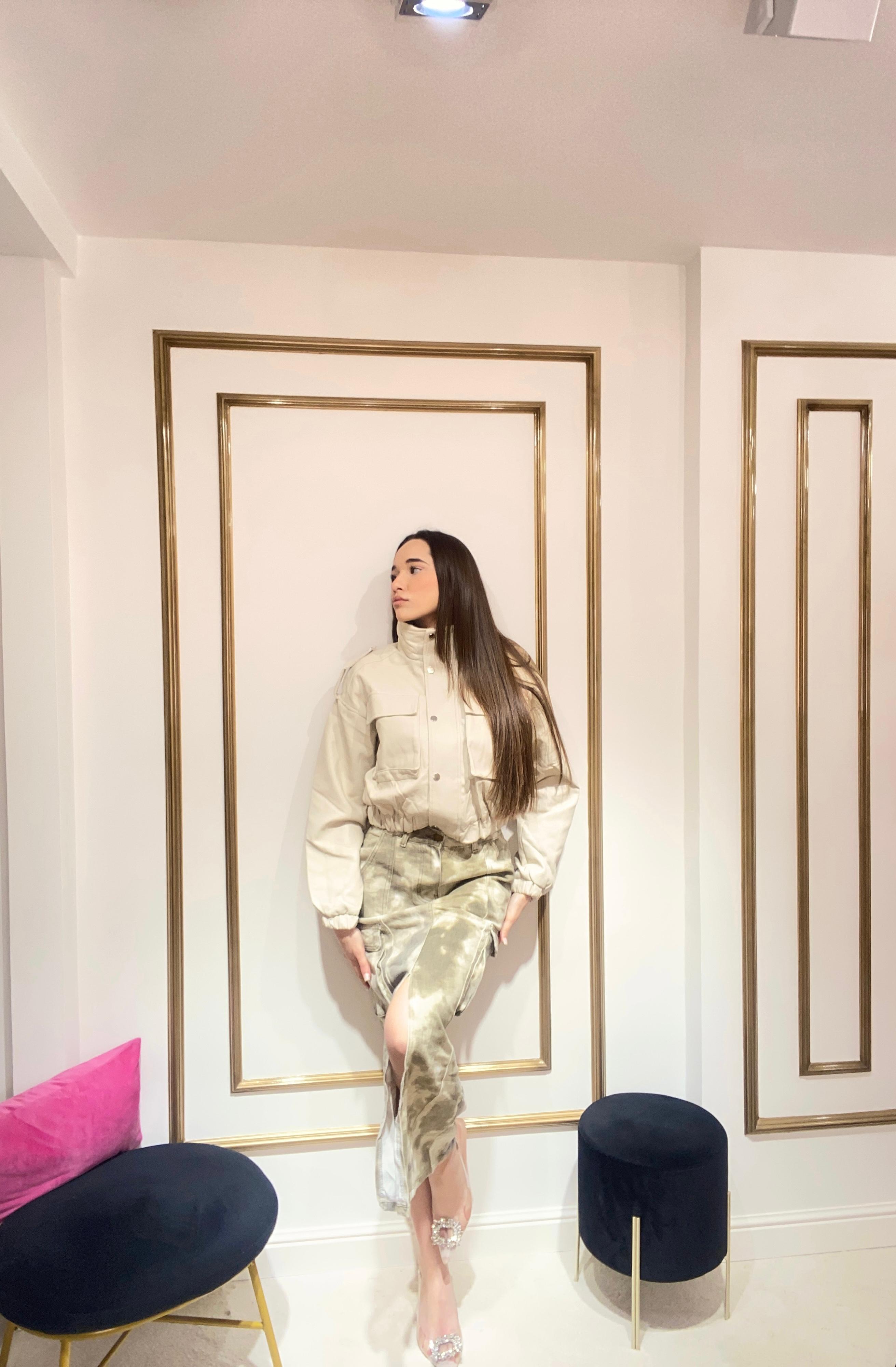 Gomma cargo ,con spacco sul davanti , fantasia mimetica , vita alta tessuto ginsato elastico