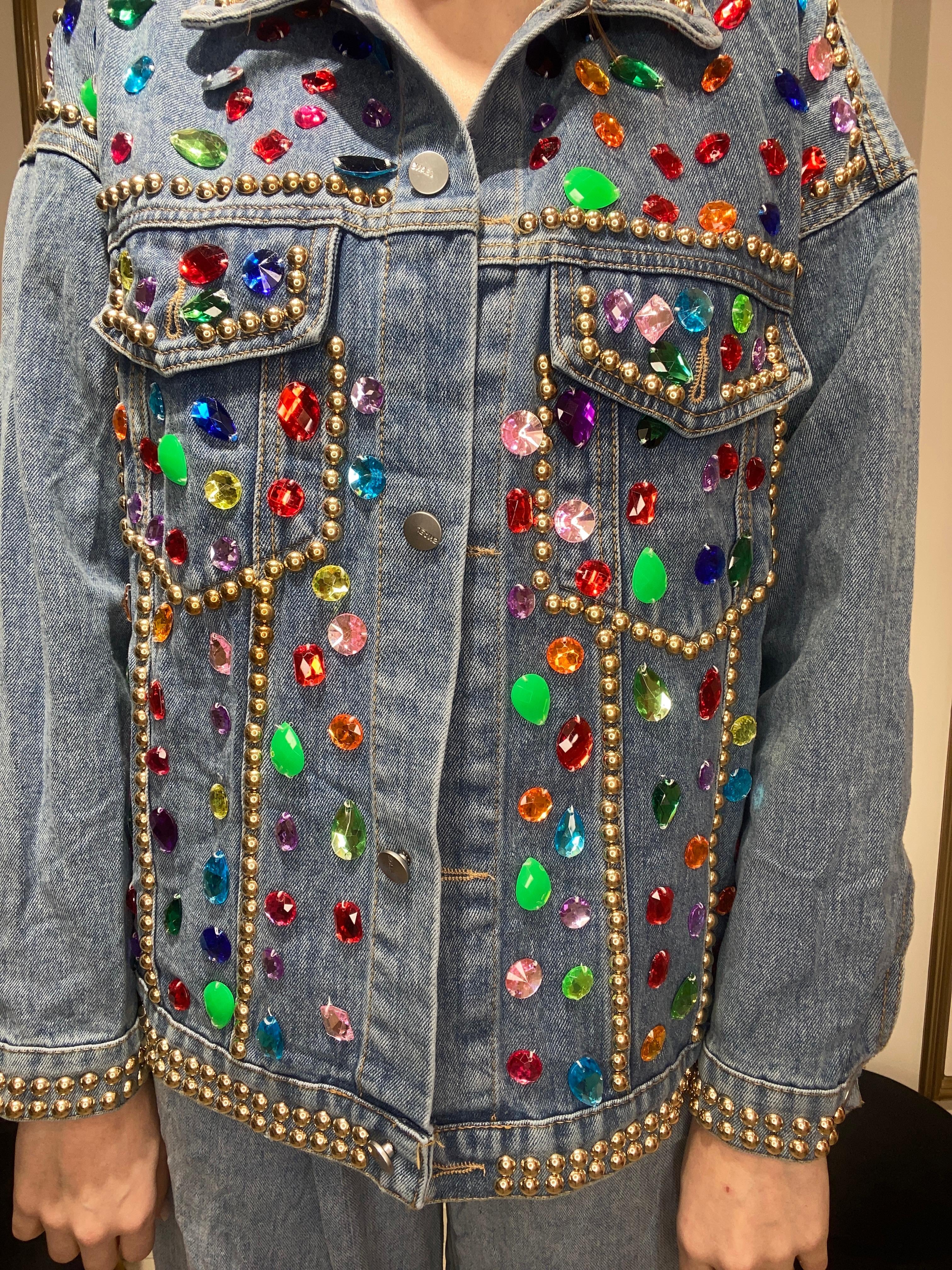 Giubbino jeans , vestibilita over , con applicazioni di pietre colorate e borchie