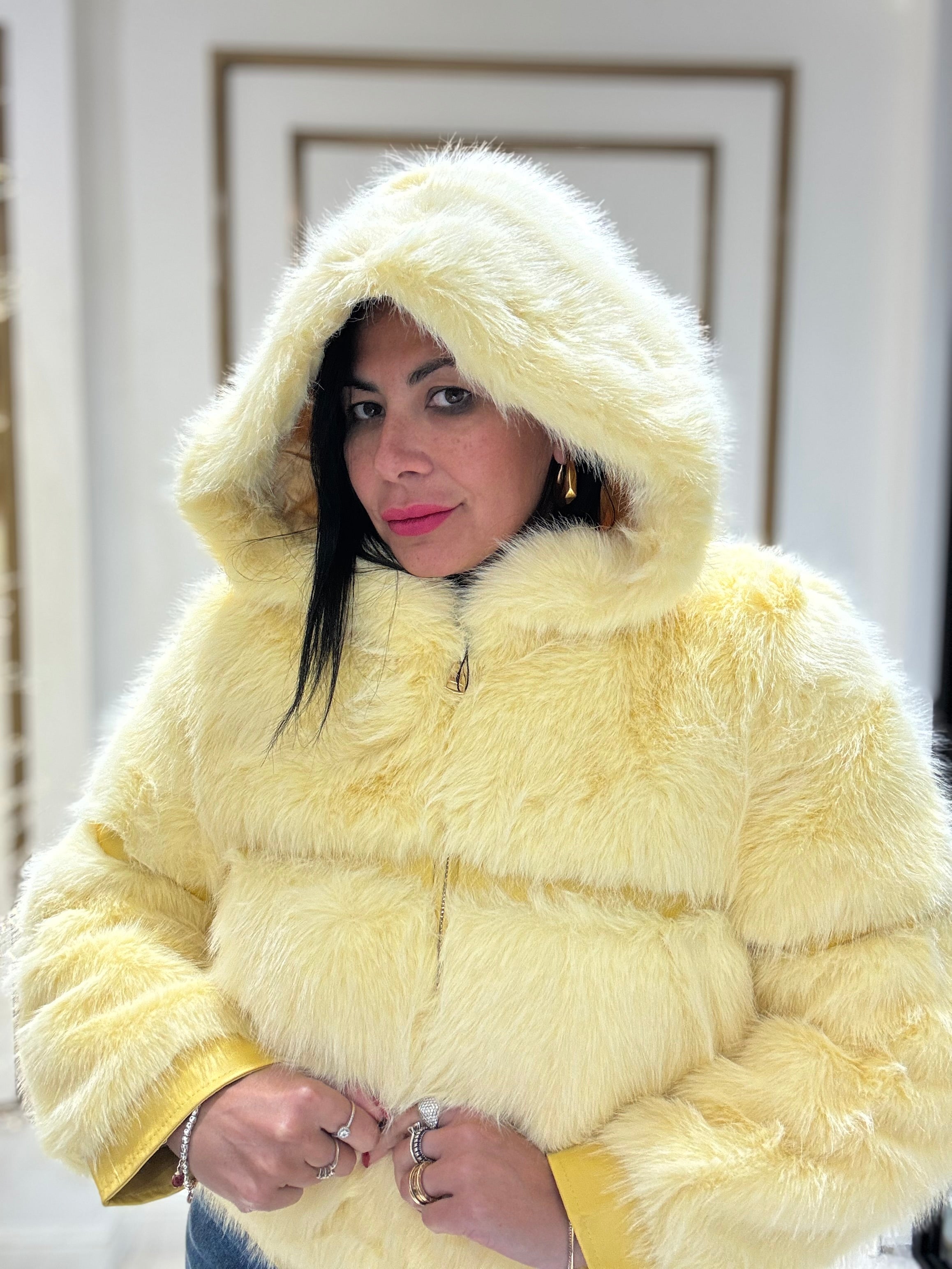 Ecopelliccia con cappuccio , dettaglio i ecopelle con zip , vestibilita fino alla 44/46